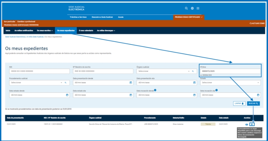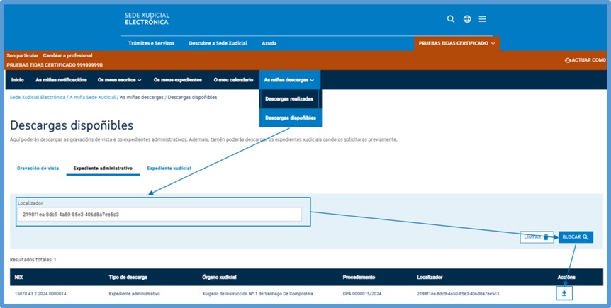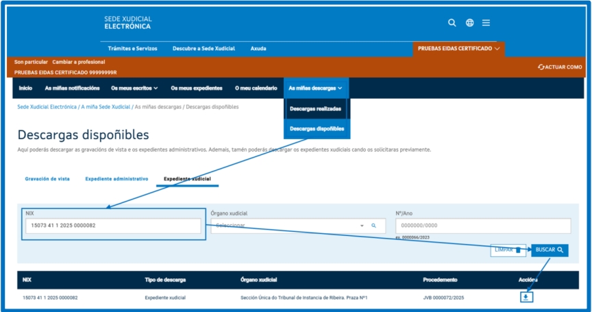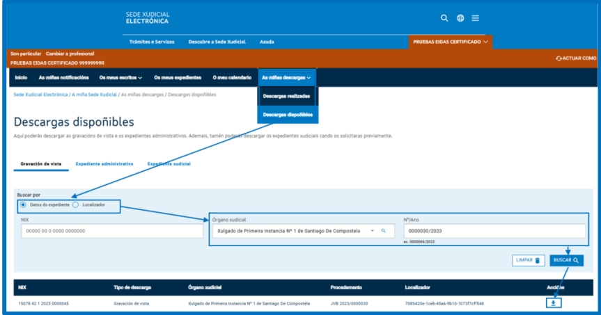 Cando se reciba o correo informando de que a descarga solicitada xa se atopa dispoñible, tanto a cidadanía como o profesionais, accederán á área privada “A miña Sede”, “Descargas dispoñibles” e seleccionarán a opción “Expediente xudicial” para localizalo a través do buscador cos seus datos de identificación (NIX, órgano xudicial, número e ano).