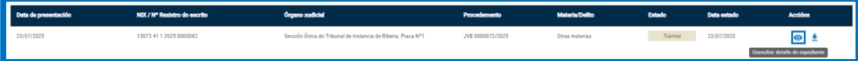 Terá dispoñible a consulta do estado do expediente desde a pestana “Os meus expedientes”. O resto de información, como a documentación detallada do expediente xudicial ou a descarga, poderalla facilitar a persoa profesional que lle representa. Así mesmo, desde a pestana “O meu Calendario” poderá consultar as sinalizacións xudiciais asociadas ao expediente.