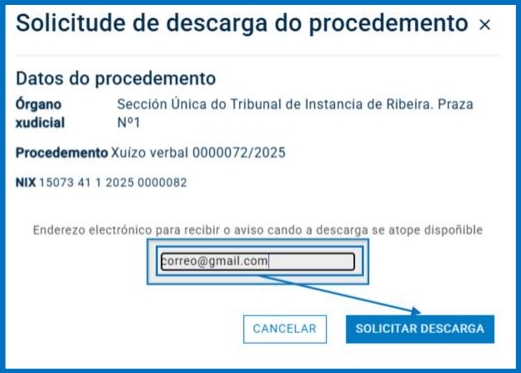 Desde a pantalla “Solicitude de descarga do procedemento”, a persoa usuaria deberá indicar o correo electrónico no que quere recibir a información para a descarga.