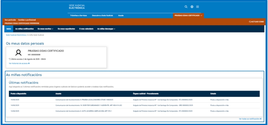 • As miñas notificacións: Para acceder ás notificacións enviadas pola Administración de Xustiza ás persoas obrigadas a relacionarse a través de medios electrónicos. Permite aceptar as notificacións recibidas e consultar o seu detalle.