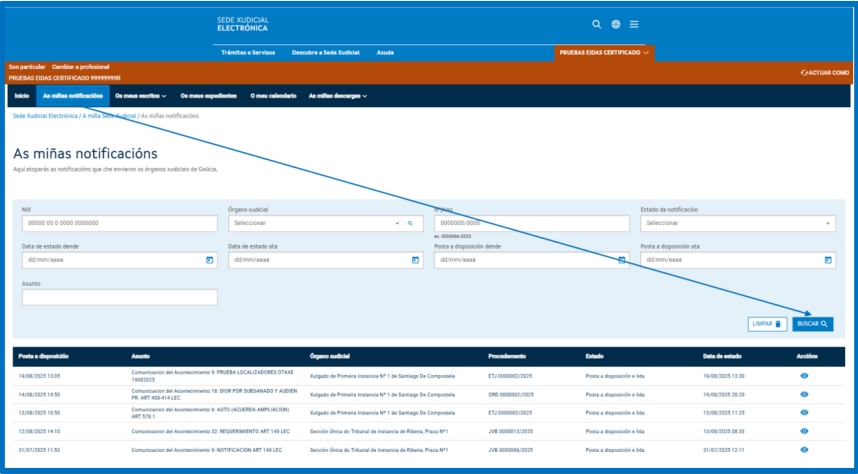 • Expedientes: Para consultar o estado, a documentación detallada dos expedientes xudiciais, solicitar a súa descarga e consultar os sinalamentos asociadas nos que a persoa profesional, de maneira individual ou como membro dun colectivo, participe en representación dalgunha das partes do procedemento en calquera órgano xudicial de Galicia.